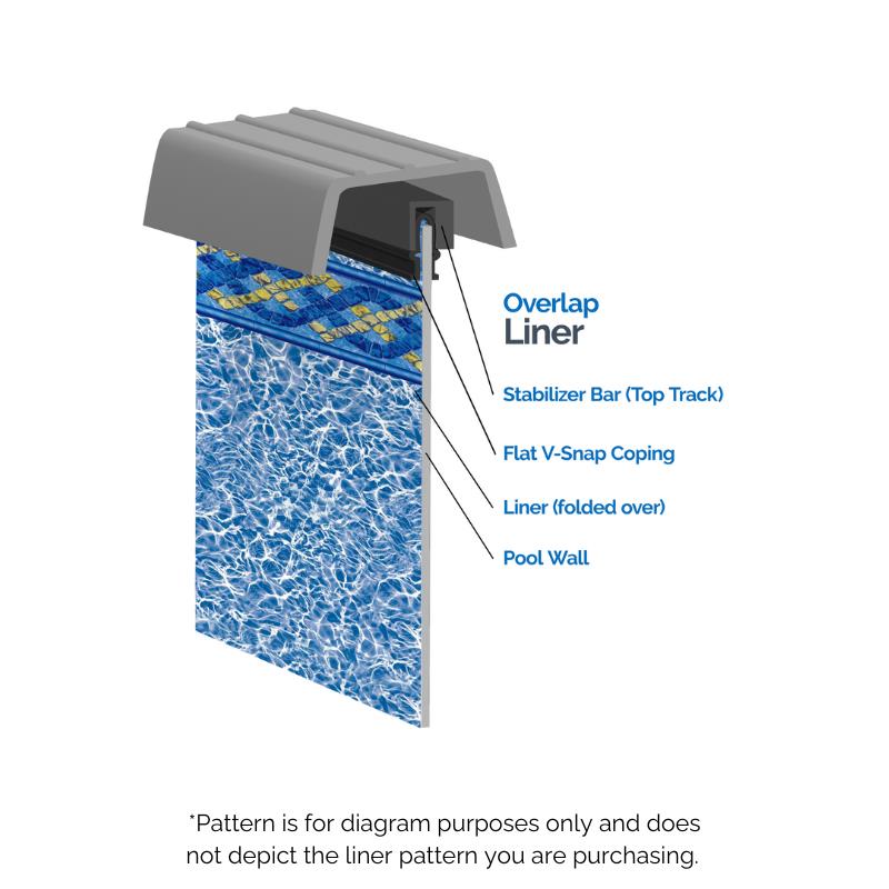 Overlap swimming pool liners hang over the pools wall, and are then secured to the top of the wall using plastic coping (click here to purchase new/replacement coping for your pool). You then place the top rail of the pool over the coping to fasten it into place. Our overlap liners work with constant depth pools, and with pools that have 48” or 52" wall heights. After connecting the liner, any excess material is to be rolled up, or cut off for a clean finish.