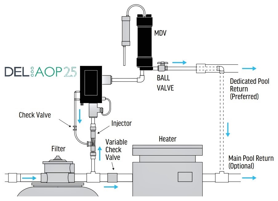 An MDV (Mixing De-Gas Vessel) should be used in all indoor, covered, and vinyl lined pools when used in conjunction with AOP units. MDV systems may also be used in outdoor applications to eliminate bubbles from your return flow.
