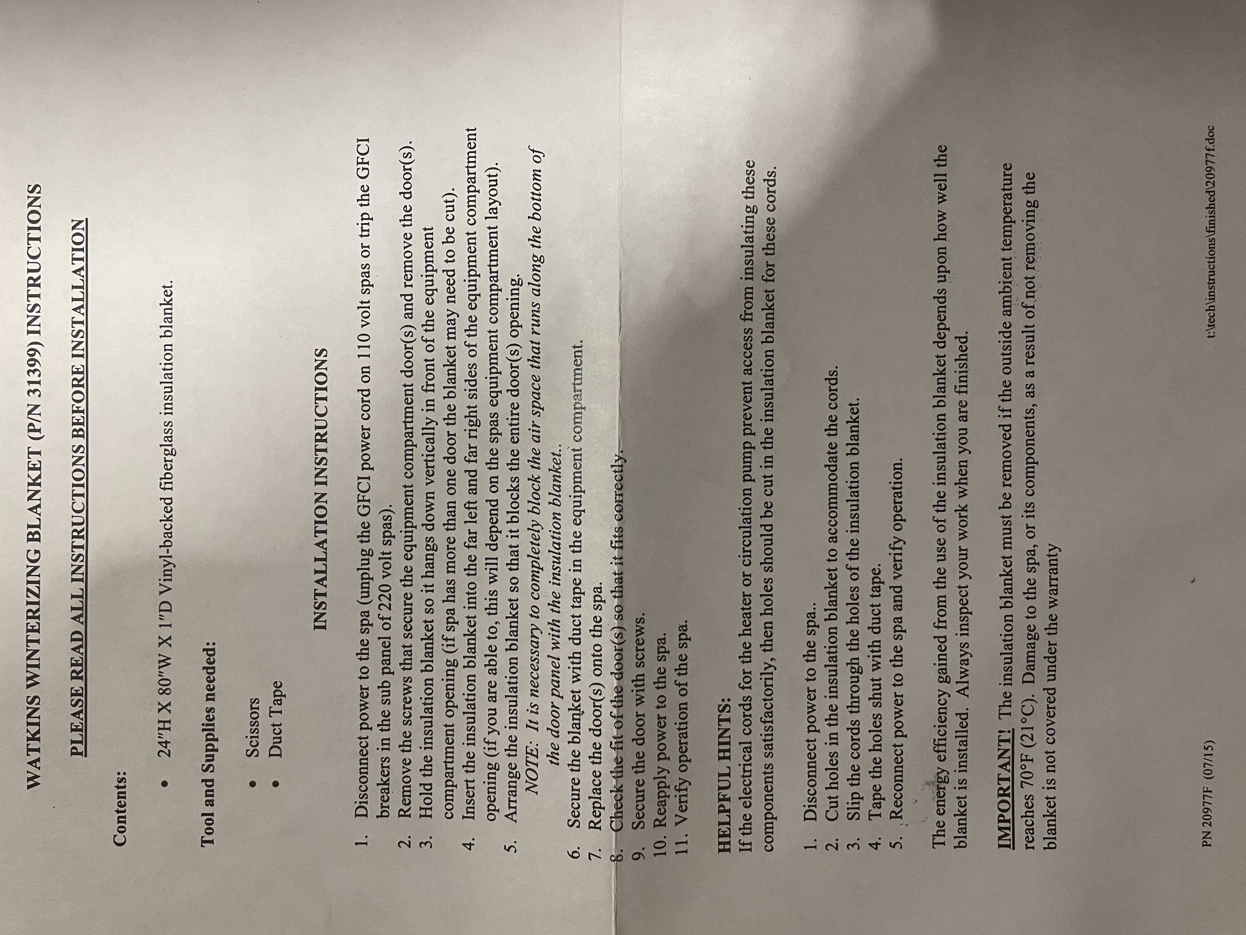 A plastic back insulation blanket designed to help keep the equipment compartment of your hot tub warm. Compatible with many HotSpring and Limelight spas post-1992. Size: 24"H x 80"W x 1"D
